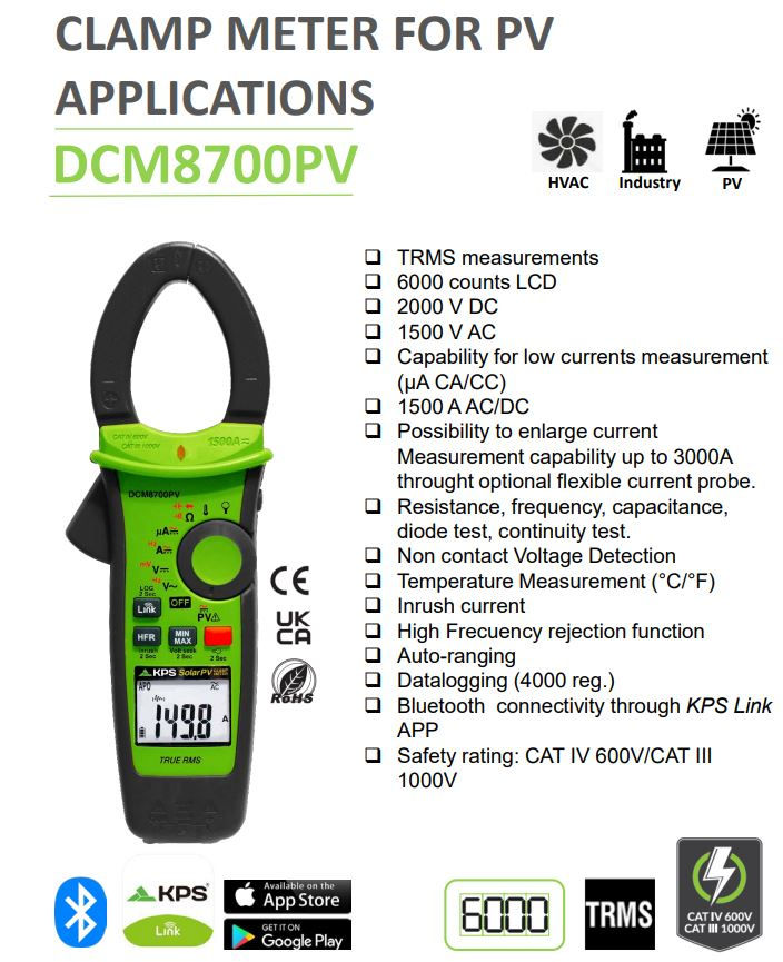 KPS DCM8700PV Solar Clamp Meter TRMS PhotoVoltaic 2000VDC 1500A AC/DC